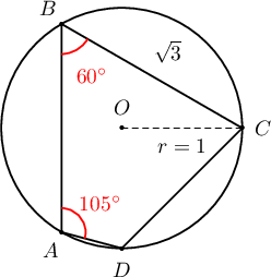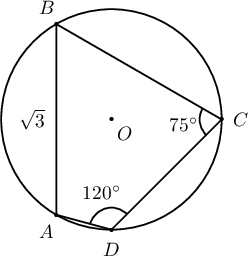 Тойрогт багтсан $ABCD$ дөрвөн өнцөгтийн $AD=\sqrt3$, $AB=1$ ба $\angle ADB=30^\circ$, $\angle CAD=75^\circ$ бол