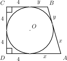 Пифагорын теоремоор $$(x+y)^2=8^2+6^2=100\Rightarrow x+y=10.$$ тул \[P_{ABCD}=AB+CD+AD+BC=(x+y)+8+(x+4)+(y+4)=2(x+y)+16=36\]