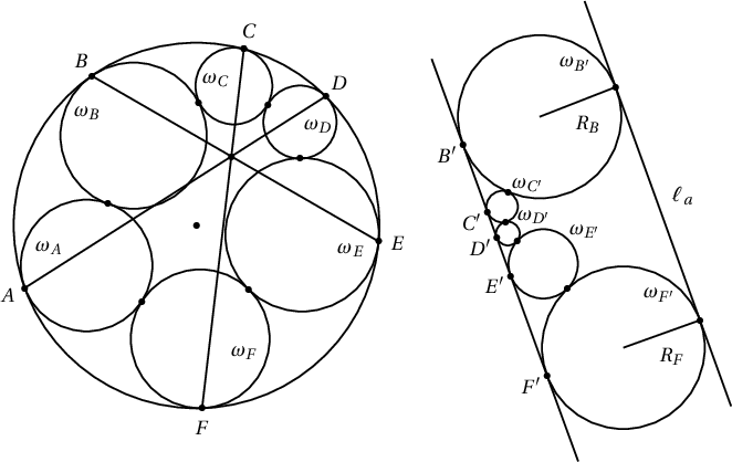 Бодолт. $A$ дээр төвтэй ирверс хийе. Тэгвэл $\omega_A\to \ell_A$, $\omega_B\to\omega_{B'}$, $\omega\to \ell$, $\omega_C\to\omega_{C'}$, $\omega_D\to\omega_{D'}$, $\omega_{E}\to\omega_{E'}$, $\omega_F\to\omega_{F'}$ болно.