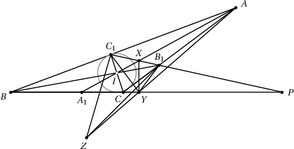 5. $ABC$ гурвалжны $AA_1$, $BB_1$, $CC_1$ биссектриссүүд татав. $AA_1\cap B_1C_1=X$ ба $X$-ээс $BC$-д буулгасан перпендикулярын суурийг $Y$ гэе. $\measuredangle BC_1Y$ ба $\measuredangle CB_1Y$-үүдийн биссектриссүүдийн огтлолцлын цэгийг $Z$ гэе. Тэгвэл $A$, $Y$, $Z$ цэгүүд нэг шулуун дээр оршино гэж батал.