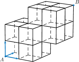 3. Зурагт өгөгдсөн дүрс 15 ширхэг нэгж кубээс тогтоно. Зөвхөн зурагт заасан чиглэлүүдийн аль нэгээр яваад $A$ оройгоос $B$ оройд хэчнээн ялгаатай замаар хүрэх вэ?