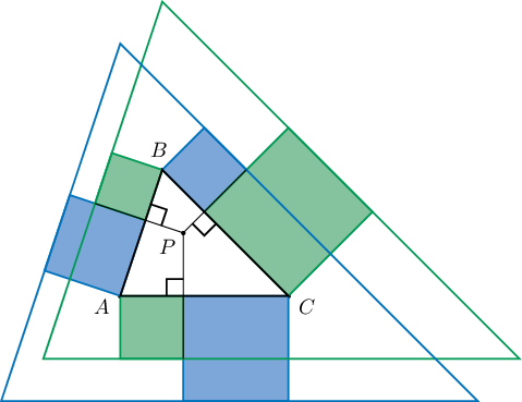 7. $ABC$ хурц өнцөгт гурвалжны дотор $P$ цэг өгөгджээ. $D$, $E$, $F$ нь $P$ цэгээс сууриуд руу перпендикуляр татав. Гурвалжны гадна талд талууд дээр үүсэх зургаан хэрчмээр талаа хийсэн квадратууд байгуулав. Тэдгээрийг зурагт үзүүлсний дагуу хоёр өнгөөр сөөлжилж буджээ. Ижил өнгийн квадратуудын гадна талуудаар үүсэх гурвалжнууд тэнцүү гэж батал.