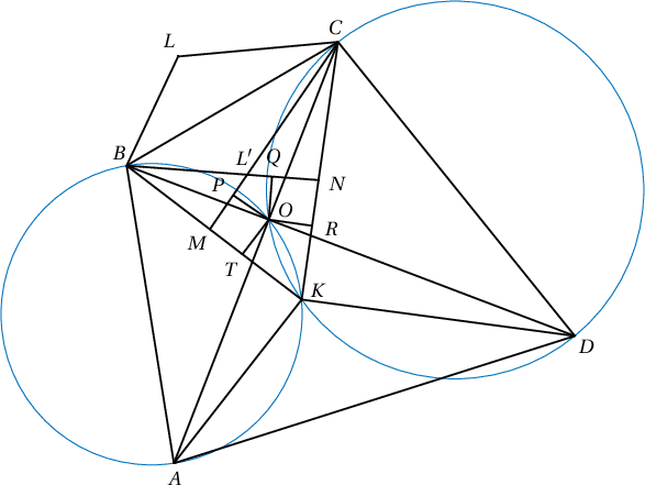 3. Тойрогт багтсан $ABCD$ дөрвөн өнцөгтийн диагоналиудын огтлолцлын цэг $O$ байг. $ABO$, $COD$ гурвалжнуудыг багтаасан тойргууд $O$ цэгээс ялгаатай $K$ цэгт огтлолцоно. Хэрэв $BLC$ ба $AKD$ гурвалжнууд төсөөтэй байхаар $L$ цэгийг $ABCD$ гүдгэр дөрвөн өнцөгтийн гадна авсан бол $BLCK$ дөрвөн өнцөгтөд тойрог багтааж болохыг батал.