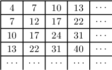 1. Зурагт үзүүлсэн хүснэгтийн эхний мөр, баганын тоонууд 3-аар өснө, 2-р мөр, баганын тоонууд 5-аар өснө, 3-р мөр баганын тоонууд 7-оор өснө, гэх мэтчилэн үргэлжилнэ. Энэ төгсгөлгүй хүснэгтэд бичигдсэн ямар ч $n$ тооны хувьд $2n+1$ нь зохиомол тоо гэдгийг батал.