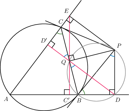 байна. Нөгөө талаас $AB$ нумд тулсан $\angle ACB$ нь $B$ цэгт татсан шүргэгчээр үүсэх $\angle PBD$ өнцөгтэй тэнцүү тул $\triangle PBD\sim\triangle CD'Q$ болно. Иймд $\angle QD'E=\angle BDE=90^\circ$ болов. Иймд $DD'$ нь $AED$ гурвалжны өндөр болов. Яг адилаар $EC'$ нь өндөр болох ба эдгээр дээр $Q$ цэг орших тул $Q$ цэг $AED$ гурвалжны орто центр болж батлах зүйл батлагдав.
