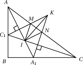 Иймд $\measuredangle CIM=90^\circ\Rightarrow MI\parallel KA_1$. Үүнтэй адилаар $NI\parallel C_1K$ болно. Эндээс $MINK$ параллелограмм болох тул $IK$ хэрчмийн дундаж цэг нь $MN$ хэрчимд агуулдана. Иймд $IK$ хэрчмийн дундаж цэг нь мөн $AC$ дээр оршино.