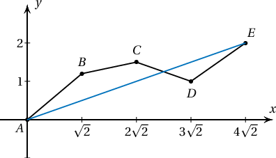 Заавар. $A(0,0)$, $B(\sqrt{2},x)$, $C(2\sqrt{2},y)$, $D(3\sqrt{2},z)$, $E(4\sqrt{2},2)$ тахир шугамын урт хамгийн багадаа хэдтэй тэнцэх вэ?