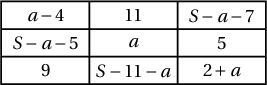 байна.Одоо үлдсэн 2 нүдэнд 9 байрлах үед шидэт квадрат байхаар бөглөж чадахгүй гэж баталъя. Зүүн доод буланд 9 байх үед баталъя. Нөгөө тохиолдолд яг адил аргаар батлагдана. Голын нүдэнд $a$ тоо байсан гэе. Мөр, багана ба диагоналын элементүүдийн нийлбэр тэнцүү $S$ байг. Тэгээд мөр баганы нийлбэрээс хоосон нүднүүдийг олвол