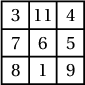 2. Аль ч мөр, аль ч багана ба хоёр диагоналийн дагуух тоонуудын нийлбэр ижил байхаар нүд бүрт нь натурал тоо бичигдсэн $3\times 3$ хэмжээтэй квадратыг шидэт квадрат гэдэг. Шидэт квадратын хоёр тоо зурагт дүрсэлсэн байдлаар өгөгджээ. Хаа нэгтээ 9 бичигдэхээр шидэт квадратыг гүйцээж бөглө (бүх боломжит байдлаар).