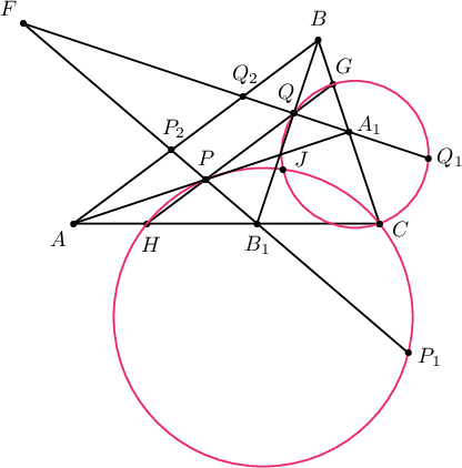 2. $ABC$ гурвалжны $BC$ тал дээр $A_1$ цэг, $AC$ тал дээр $B_1$ цэг байрлана. $AA_1$ хэрчим дээрх $P$ цэг ба $BB_1$ хэрчим дээрх $Q$ цэгийн хувьд $PQ$ нь $AB$ шулуунтай параллел болог. $PB_1$ шулуун дээрх $P_1$ цэгийн хувьд $B_1$ цэг $P$, $P_1$ цэгүүдийн хооронд эдгээртэй давхцахгүйгээр байрлах бөгөөд $\angle PP_1C=\angle BAC$ байдаг гэе. Мөн ижлээр, $QA_1$ шулуун дээрх $Q_1$ цэгийн хувьд $A_1$ цэг $Q$, $Q_1$ цэгүүдийн хооронд эдгээртэй давхцахгүйгээр байрлах бөгөөд $\angle CQ_1Q=\angle CBA$ байдаг гэе. $P$, $Q$, $P_1$, $Q_1$ цэгүүд нэг тойрог дээр оршихыг батал.