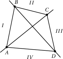 $I$, $II$, $III$, $IV$ хэсгүүдийн аль нэгд нь үлдэх 4 цэгээс хоёр нь ордог байг. Уг хоёр цэг $I$ хэсэгт байдаг гэж үзэхэд явцуурахгүй. Энэ тохиолдолд $ABCD$ дотор өөр цэг байх боломжгүй тул уг хоёр цэгийг холбосон хэрчим болон $AD$, $BC$ хэрчмийг нэгэн зэрэг огтлох шулуун олдохгүй.