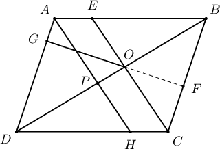 байна. Хэрэв $OP=x$ гэвэл $OB=3x$ байна. $AECH$ параллелограмм учир $AE=CH$. Иймд $DH=EB$, $\measuredangle PHD=\measuredangle OEB$, $\measuredangle PDH=\measuredangle EBO$ учир $\triangle DPH=\triangle BOE$. Иймд $DP=OB=3x$. Хэрэв $AG=y$ гэвэл $DG=4y$ тул $BC=AD=5y$ байна. Иймд $BF=3y$, $FC=2y$ болно.