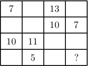 Бодолт. Зааварт бичигдсэн чанар ёсоор зүүн доод буланд бичигдсэн тоо $10+5-11=4$, баруун дээд буланд бичигдсэн тоо $13+7-10=10$ байна. Иймд баруун доод буланд бичигдсэн тоо $4+10-7=7$ байна.