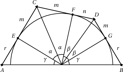 5. Урт нь үл мэдэгдэх $AB$ хэрчмийн дундаж дээр төвтэй, $|AB|$-ээс бага диаметртэй хагас тойргийг байгуулан түүнд $A$, $B$ цэгүүдээс $r$ урттай шүргэгчдийг татаж; нэгийг нь цааш $n$, нөгөөг нь $m$ урттайгаар үргэлжлүүлэн үзүүрүүдийг нь холбоход гарах хэрчим тойргийг шүргэж байсан бол хагас тойргийн радиусыг ол.