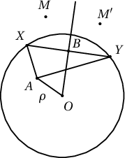 Бодолт. $O$ нь тойргийн төв ба $XY$ хөвчид перпендикуляр радиусын хувьд $M$ цэгтэй тэгш хэмтэй орших цэг нь $M'$ бол $OM=OM'$ байна. $\rho=OA$ ба $r$ нь өгөгдсөн тойргийн радиус байг.