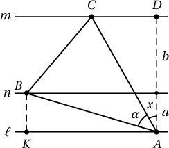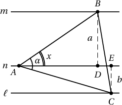 Бодолт. Параллель 3 шулуунаа харгалзан $m, n, \ell$ гэе. Бодлого 3 тохиолдолтой. Учир нь адил хажуут гурвалжны $\alpha$ өнцөгтэй орой нь $m, n, \ell$ шулуунуудын аль нь дээр ч оршиж болно.