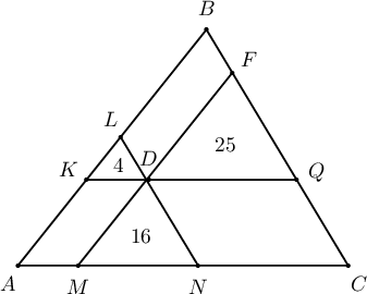 Зурагт дүрсэлсэн $ABC$ гурвалжин дотор орших $D$ цэгийг дайруулан талуудтай параллель шулуунууд татахад 4, 16, 25 кв.нэгж талбайтай гурвалжингууд үүсэх бол $S_{ABC}=?$