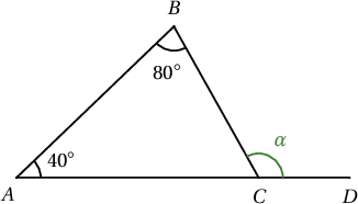 - $\overrightarrow{AC}$, $\overrightarrow{AB}$ векторын хоорондох өнцөг болох $A$ оройн дотоод өнцгийг $\alpha$ гэвэл $\alpha=\fbox{bc}^\circ$ байна.