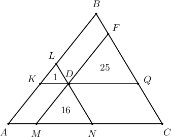 Зурагт дүрсэлсэн $ABC$ гурвалжин дотор орших $D$ цэгийг дайруулан талуудтай параллел шулуунууд татахад 1, 16, 25 кв.нэгж талбайтай гурвалжингууд үүсэх бол $S_{ABC}=?$