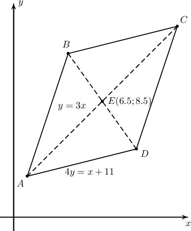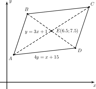- $AC$ ба $BD$ диагоналиудын огтлолцлын цэгийг $E$ гэвэл $\displaystyle \sin\widehat{AEB}=\dfrac{\fbox{i}\sqrt{\fbox{j}}}{\fbox{k}}$, багтаасан тойргийн радиус $\dfrac{\fbox{l}\sqrt{\fbox{m}}}{3}$ байна.