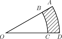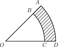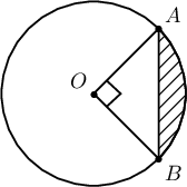 Дараах зурагт $O$ цэг тойргийн төв. $OA=OB=5$ см (радиусууд) бол будагдсан хэсгийн талбайг ол.