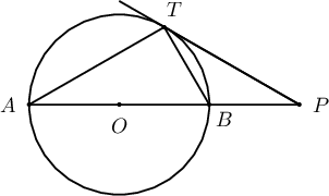 $AB$ нь $O$ цэгт төвтэй 2 радиустай тойргийн диаметр байв. Зурагт үзүүлсэн $PT$ шүргэгч шулуун татахад $\angle BAT=30^\circ$ байв.