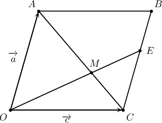 $OABC$ параллелограммын $BC$ талыг $BE:EC=2:3$ харьцаагаар хуваах цэгийг $E$ гэе. $AC$ диагональ $OE$ хэрчимтэй $M$ цэгт огтлолцдог байв. $\overrightarrow{OA}=\overrightarrow{a\vphantom{OA}}$, $\overrightarrow{OC}=\overrightarrow{c\vphantom{OC}}$ вектороор $\overrightarrow{OM}$ векторыг илэрхийлээрэй.