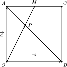 $OACB$ квадратын $AC$ талын дундаж цэг $M$ ба $AB$ диагональ $OM$ хэрчимтэй $P$ цэгт огтлолцдог. Хэрэв $\overrightarrow{OA}=\overrightarrow{a\vphantom{OA}}$, $\overrightarrow{OB}=\overrightarrow{b\vphantom{OA}}$ бол $\overrightarrow{PM}$-ийг $\overrightarrow{a\vphantom{OA}}$, $\overrightarrow{b\vphantom{OA}}$-ээр илэрхийл.