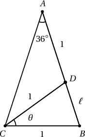 Зургаас харвал $\triangle CBD \sim \triangle ABC$ тул $\dfrac{BD}{BC}=\dfrac{BC}{BA}$ болох ба $BC=1$, $BD=\ell$ гэвэл $\dfrac {\ell}1=\dfrac1{\ell+1}$-ийг бодож $\ell$-ийг олбол: $\ell=\dfrac{-1+\sqrt{5}}{2}$, $\triangle CBD$ гурвалжны хувьд косинусийн теорем бичиж $\cos\theta$-ийг олбол: $$\cos \theta=\dfrac{1^2+1^2-\ell^2}{2\cdot 1\cdot 1}=\dfrac{1+\sqrt{5}}{4}.$$