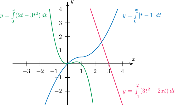 - $y=\int\limits_{-1}^{2}(3t^2-2xt)\,dt$