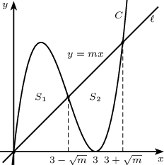 $C\colon y=x^3-6x^2+9x$, $\ell: y=mx$ байг. $C$ ба $\ell$ нь $x\geq 0$ байх ялгаатай 3 цэгүүдээр огтолцох ба огтлолд үүсэх 2 хэсэг талбай тэнцүү бол $m$-г ол.
