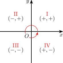 - Координатын тэнхлэгүүдийн аль талд нь оршихоос нь хамааруулж мужийг тодорхойлдог. I, II мужууд нь $OX$ тэнхлэгийн дээр орших мужууд, харин III, IV мужууд нь $OX$ тэнхлэгийн доор орших мужууд юм. Үүнтэй төстэйгөөр I, IV мужууд нь $OY$ тэнхлэгийн баруун гар талд орших мужууд, харин II, III мужууд нь $OY$ тэнхлэгийн зүүн гар талд орших мужууд байна. Үүнийг мөн цэгийн координатуудын тэмдэгийг ашиглан тооцоолж болно.
