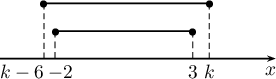 - $A=\{x\mid -2\le x\le 3\}$, $B=\{x\mid k-6\le x\le k\}$ $(k\in\mathbb R)$ бол $A\subseteq B$ байх $k$ параметрийн утгуудыг ол.