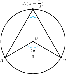 - Тойргийн нумд тулсан өнцөг нь төв өнцгийнхөө хагастай тэнцүү байдаг. Иймд $$\measuredangle BAC=\dfrac{\measuredangle BOC}{2}\Rightarrow \measuredangle BOC=2\cdot\measuredangle BAC=\dfrac{2\pi}{3}$$ Нөгөө талаас $ABC$ нь зөв гурвалжин тул $$\measuredangle BOA=\measuredangle BOC=\dfrac{2\pi}{3}$$