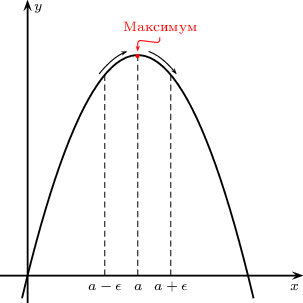 Заавар: Хэрвээ ямар нэг $\epsilon>0$ тооны хувьд функц $]a-\epsilon;a]$ мужид өсдөг, $[a;a+\epsilon[$ мужид буурдаг бол тухайн функцийг $x=a$ цэг дээр максимумтай байна гэдэг.