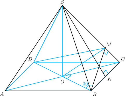 $ABCDS$ зөв дөрвөн өнцөгт пирамидын суурийн тал 6 нэгжтэй тэнцүү. $S$ оройгоос суурийн хавтгайд буулгасан өндрийн суурийг $O$ гэе. $D$ ба $B$ цэгүүдээс $SC$ ирмэгт харгалзан $DM$ ба $BM$ перпендикулярууд буулгасан ба $\angle OBM=30^\circ$ байв.