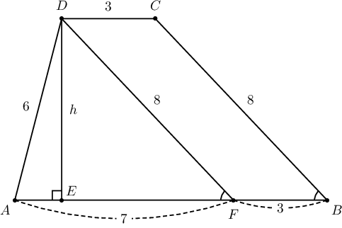 Трапецийн сууриудын урт нь $3$ ба $10$ нэгж, хоёр хажуу нь $6$ ба $8$ нэгж байсан бол трапецийн өндрийг ол.