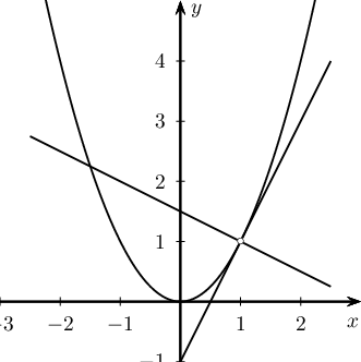 $y=x^2$ функцийн $A(1,1)$ цэгт татсан шүргэгч шулууны тэгшитгэл нь $y=\fbox{a}x-\fbox{b}$ байна. $A$ цэгийг агуулсан шүргэгчид перпендикуляр шулууны тэгшитгэл нь $\fbox{c}x+\fbox{d}y-3=0$ байна.