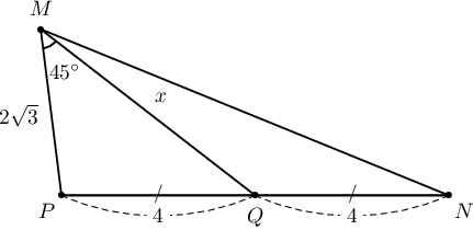 $MNP$ гурвалжинд $MQ$ медиан татжээ. Хэрэв $MP=2\sqrt3$, $NP=8$, $\measuredangle QMP=45^\circ$ бол $MNP$ гурвалжны талбайг ол.