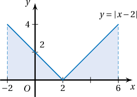 $\displaystyle\int_{-2}^{6}|x-2|\mathrm{d}x$ интеграл нь будагдсан хэсгийн (2 гурвалжны) талбайтай тэнцүү тул $\dfrac{4\cdot 4}{2}+\dfrac{4\cdot 4}{2}=16$ байна.