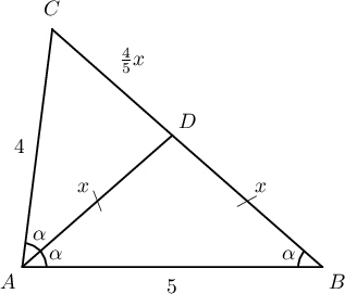 Заавар: $AD=DB=x$ ба $\angle CAD=\angle BAD=\alpha$ гэвэл $\triangle ADB$ адил хажуут тул $\angle ABD=\alpha$ байна. Биссектрисийн чанар ёсоор