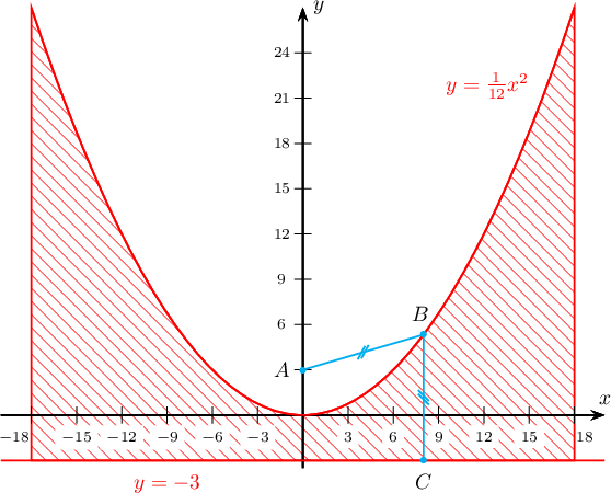 Заавар: $A(0;3)$, $m\colon x=-3$ гээд бод. (Ер нь бодлогын нөхцлийг хангах цэг ба шулуун төгсгөлгүй олон олдох бөгөөд тухай бүрт нь тэгшитгэл нь өөр өөр гарах тул энэ бодлогын нөхцөл дутуу юм). Дүрсийн талбай нь $$\int\limits_{-18}^{18}\bigg(\frac{x^2}{12}+3\bigg) \,\mathrm{d}x$$