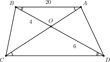 $AB$, $CD$ суурьтай $ABCD$ трапецын диагоналиудын огтлолцлын цэг $O$ байг. $BO=4$, $OD=6$ ба $AB=20$ бол трапецын дундаж шугамын уртыг ол.