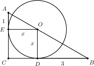 $ABC$ тэгш өнцөгт гурвалжны $AB$ гипотенуз дээр төв нь орших тойрог $AC$ ба $BC$ талуудыг харгалзан $E$, $D$ цэгүүдээр шүргэв. Хэрэв $AE=1$, $BD=3$ бол $\measuredangle BAC=\fbox{ab}^\circ$, $\triangle ABC$-ийн периметр нь $\fbox{c}+\fbox{d}\sqrt3$, багтсан тойргийн радиус $\fbox{e}$ байна.