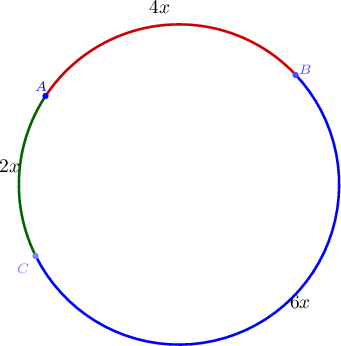 $A$, $B$, $C$ цэгүүд нь тойргийг $2:4:6$ харьцаатай нумуудад хуваадаг бол эдгээр цэгүүдээр үүсэх өнцгүүд нь аль вэ?