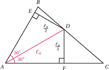 Заавар: Биссектрисээр хуваагдсан хоёр гурвалжны биссектрисийн сууриас татсан өндрүүд хоорондоо тэнцүү $\ell_a\sin30^\circ$ болохыг ашиглан гурвалжны талбайг олж бод.