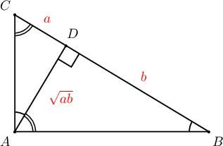 $\triangle ABC$ тэгш өнцөгт гурвалжинд $AD$ өндөр татвал $\triangle ADC\sim\triangle BDA$ тул $$\dfrac{CD}{AD}=\dfrac{AD}{BD}\Rightarrow AD=\sqrt{CD\cdot DB}=\sqrt{ab}$$