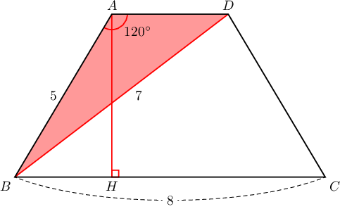 $AD\parallel BC$ байх трапецийн $AB=5$, $BC=8$, $BD=7$, $\angle A=120^\circ$ байв. Трапецийн талбайг ол.