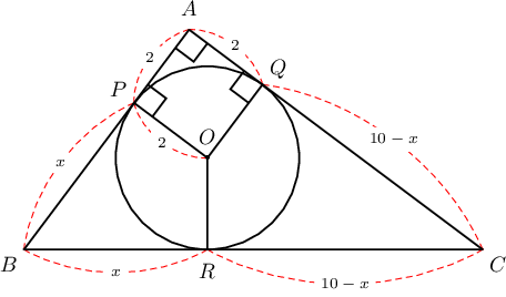 Шүргэлтийн цэгүүдийг $P$, $Q$, $R$ ба $BP=x$ гэе. Тэгвэл $BP=BR=x$, $CR=CQ=10-x$ ба $APOQ$ нь квадрат тул $AP=AQ=2$ байна.