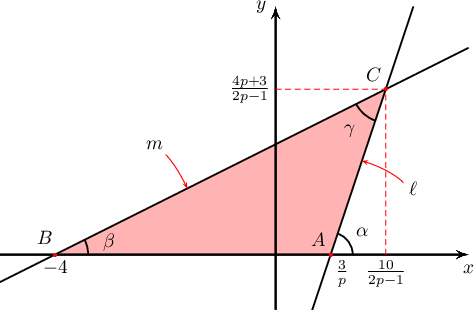 Заавар: $\left\{\begin{array}{c} y=px-3\\ y=\frac12x+2\end{array}\right.$ систем тэгшитгэлийг бодож огтлолцлийн цэг $C$-ийн координатыг олно. Энэ цэгийн $y$ координат нь $ABC$ гурвалжны өндөр болох ба $AB$ талын урт нь $\ell$, $m$ шулуунуудын $x$ тэнхлэгийг огтлох цэгүүдийн хоорондох зай байна. Мөн $p>0$ ба бүхэл тоо гарах ёстой тул $p\ge 1$ гэж үзэж болно.